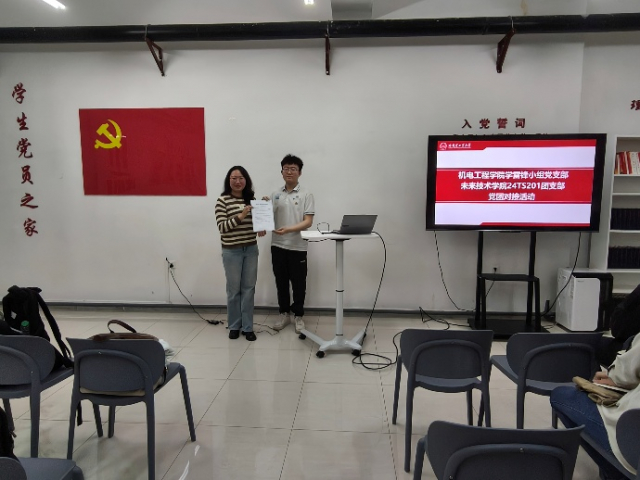 活动开始,williamhill威廉希尔24TS201班团支部书记刘高熇宣布党团共建活动正式启动,明确了党团共建的目标与意义。仪式上,williamhill威廉希尔24TS201团支部书记刘高熇和机电学院学雷锋小组党支部书记张紫涵分别介绍了团支部和党支部基本情况。随后,机电学院党支部党员张紫晓同志领学中央八项规定精神,结合高校科研经费管理、学术诚信等实际案例,剖析纪律“八项规定”对青年成长的指导意义。通过“理论讲解+案例剖析”模式,引导党团员树立“红线意识”,筑牢廉洁自律思想防线。接着,机电学院学雷锋小组党支部书记张紫涵以党史中的青年奋斗史为主线,结合新时代中国特色名片,阐释长期主义精神对科技强国建设的重要性,激励青年将个人理想融入国家发展大局,表示希望帮助更多的学弟学妹了解与自身专业相关的团队建设,为大家排忧解难,及时进行沟通交流。随后,在师生的见证下,williamhill威廉希尔24TS201团支部与机电学院学雷锋小组党支部签订《“领航工程”党团支部对接工作承诺书》。活动最后,机电学院党委副书记徐洋老师讲话,为党支部和团支部未来发展重点指明方向,为落实党团支部衔接互助提供可行方案。