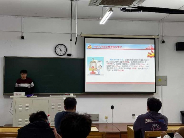 之后,党支部副书记韩佳轩向同学们讲解中央八项规定精神,他强调“八项规定”是行为准则、基本依据和标准,它不是一阵风,而是长久有效的铁规矩,无论何时都应该牢记于心。