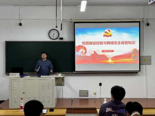 随后,辅导员孙海洋老师针对党团建设经验以及网络安全知识对同学们进行教育指导。孙老师建议团支部同学们建立 “线上 + 线下” 学习体系,线上利用学习强国、青年大学习等平台推送理论知识,线下组织专题党课、团课的形式学习党团的理论知识;并鼓励大家开展红色教育基地参观,在沉浸式体验中感悟红色精神,结合乡村振兴、社区服务,组织党团员参与支教、助老、环保等志愿服务,将理论学习转化为服务社会的实际行动。同时,孙老师还特别强调了网络安全的重要性,通过案例教育提醒同学们在日常学习生活中时刻注意网络安全。