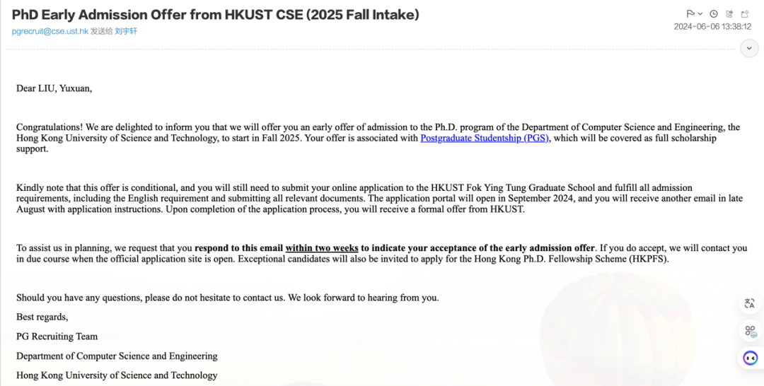 在足球队期间,我有幸结识了19级一位学长。通过与他的深入交流,我的升学视野不再局限于大陆高校。在与多位保外的学长学姐交流后, 我逐渐意识到海外科研环境对我可能更加适合,并在综合权衡后最终将目标锁定在港三。从大三寒假起,我便系统性地推进申请准备工作:筛选方向导师,分析学生背景,制作个人简历,复盘科研项目,准备面试内容……最终,在学院的帮助下,我在去年五月通过香港高校合作项目成功获得香港科技大学计算机科学与工程系的直博录取资格。